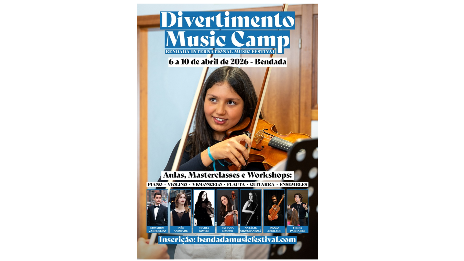 Destinado a alunos de piano, violino, violoncelo, flauta e guitarra, com idades compreendidas entre os 8 e os 13 anos, o Divertimento Music Camp terá lugar de 6 a 10 de abril de 2026, na Bendada.